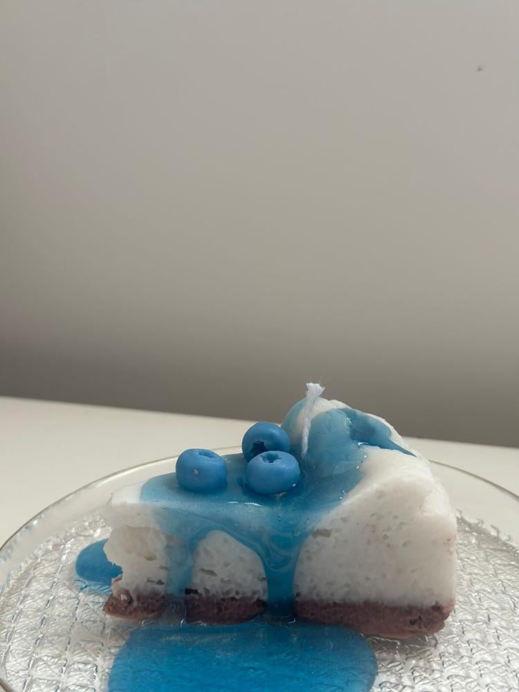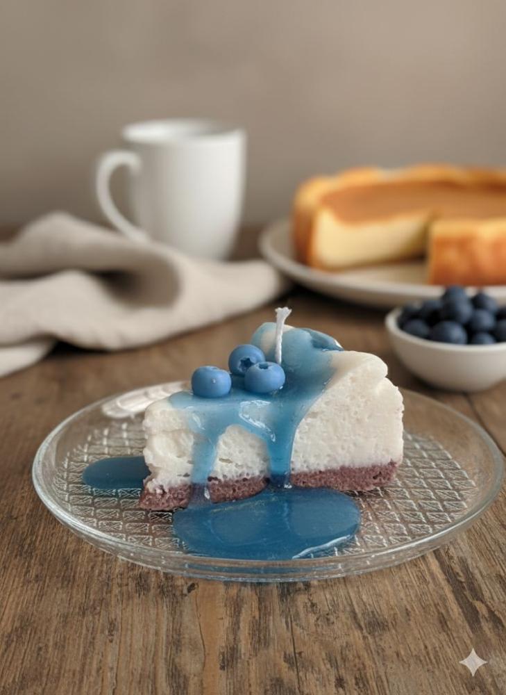 قطعة شمعة بتصميم تشيز كيك بلوبيري تبدو وكأنها حلوى فاخرة، موضوعة على طبق زجاجي أنيق بخلفية راقية من الرخام الأبيض ولمسات إضاءة طبيعية ناعمة تعكس بريق اللون الأزرق المميز. يظهر الكريم الأبيض بتفاصيله الكريمية، مع صوص أزرق لامع ينساب بانسيابية جذابة، في مشهد راقٍ وهادئ يوحي بالفخامة والذوق الرفيع