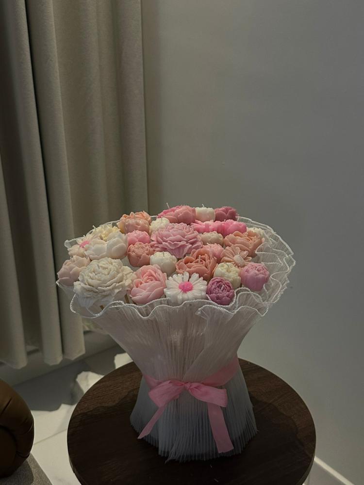 باقة أنيقة من شموع الورود بألوان وردية وبيضاء ناعمة، ملفوفة ببراعة في غلاف شبكي أبيض ومربوطة بشريط حريري وردي فاتح.